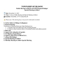Here are the agendas for the Town of Bloom Caucus and a Special Meeting (which is being held after the Caucus) for January 18, 2025 at 1:00PM